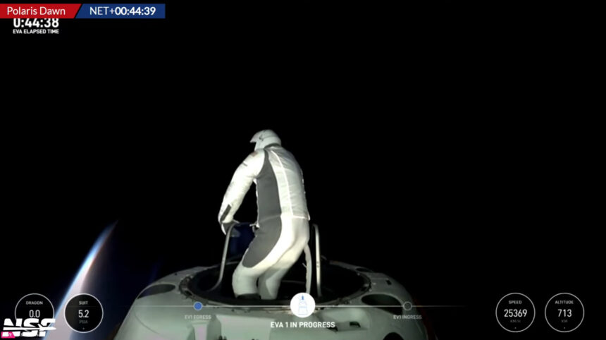 During the spacewalk, the capsule’s hatch opened to the vacuum of space, exposing the crew to an environment only a few have experienced. For approximately 20 minutes, Isaacman and Gillis navigated the space outside their capsule, with Isaacman stepping out first at around 7 a.m. ET. He used a mobility aid called “Skywalker,” a ladder-like device, to explore the void of space. Shortly after, Gillis followed to test the suit’s mobility features.