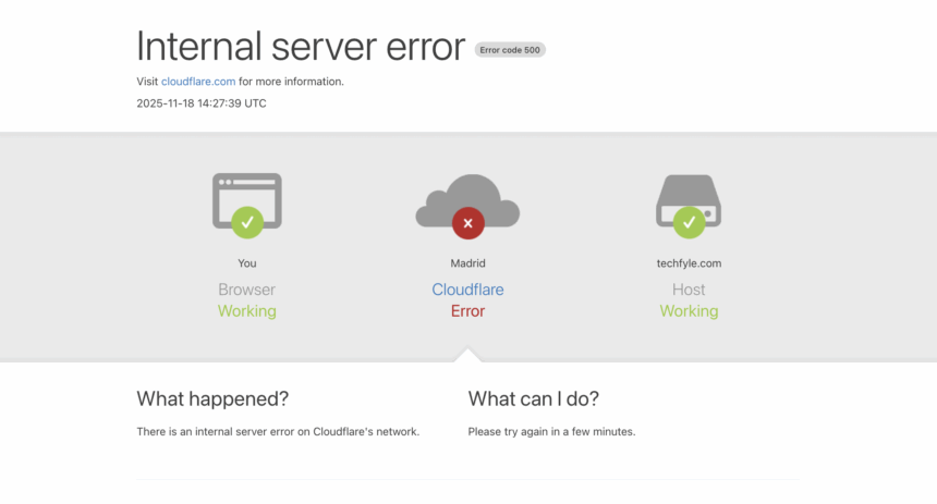 Engineers at Cloudflare reported a spike in “unusual traffic” around 11:20 a.m. GMT. The company says the surge hits one of its core services and created a chain reaction. Some requests passed normally. Many did not. Users saw 500 errors. Dashboards stopped loading. APIs returned failure messages.