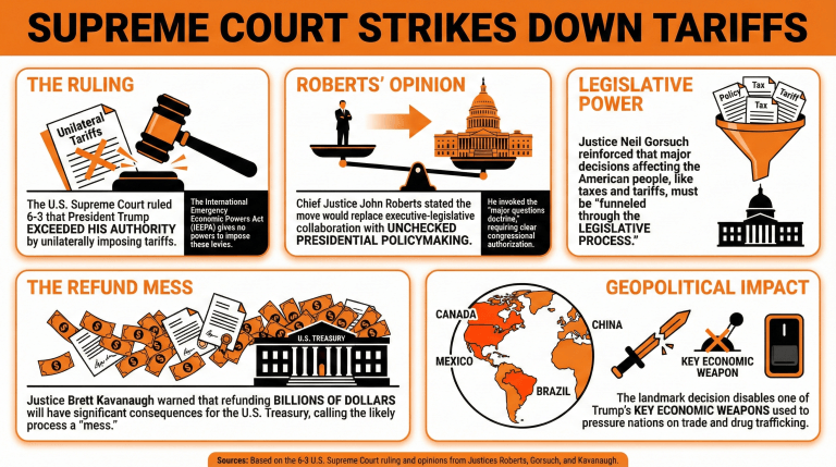 In a major ruling, the Court blocks the use of emergency powers to impose sweeping tariffs, concluding that the authority belongs to Congress, not the president acting alone. The decision scrambles trade strategy, threatens massive refunds to businesses, and forces a rethink of how economic pressure gets applied in a geopolitically tense world.